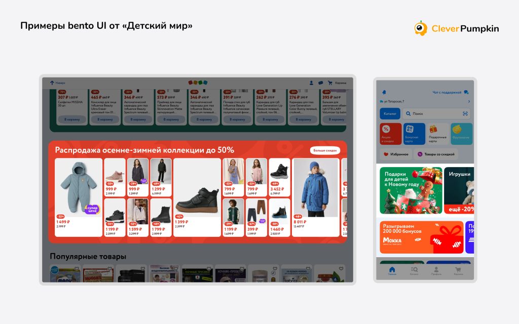 Мы интегрировали bento-сетку не только в интерфейсы, но и в графический стиль «Детского мира» — в баннеры, навигацию и витрины. На старте процесс шел медленно, так как нужно было адаптировать bento к детской эстетике, придумать, как он будет сочетаться с фирменными кубиками, подобрать корректные радиусы и общее ощущение пластики. Но после того как мы выстроили свои правила, работа стала заметно быстрее. Bento дал нам структурность и предсказуемость, которые ускоряют сборку материалов.