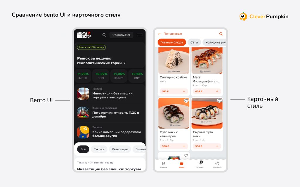 Bento отличается от карточного своей композиционностью. В нем контент разбивается на четкие, как в японском ланч-боксе, квадратные или прямоугольные секции, что создает упорядоченность, упрощает адаптацию и улучшает восприятие, особенно на мобильных устройствах. При сохранении карточности интерфейс становится более динамичным.