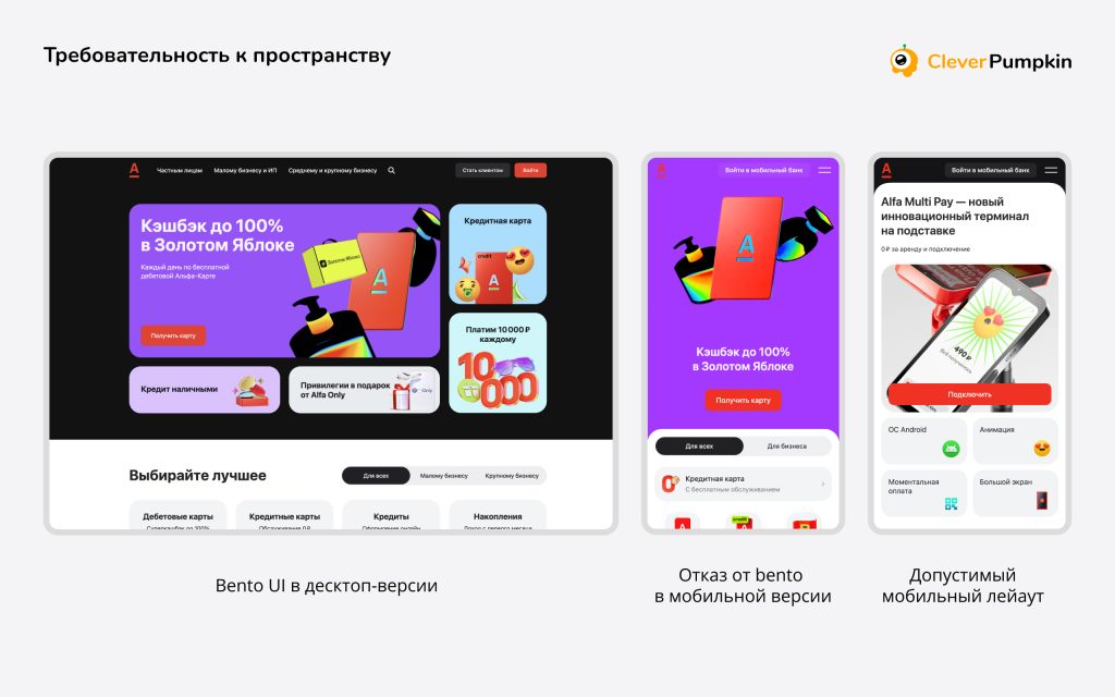 «Альфа-Банк» уже давно применяет блочную вёрстку. Bento лишь ускорил выбор креативных вариантов выделения нужного контента. Этот прием стал общим для команд всех направлений, что повысило консистентность страниц».