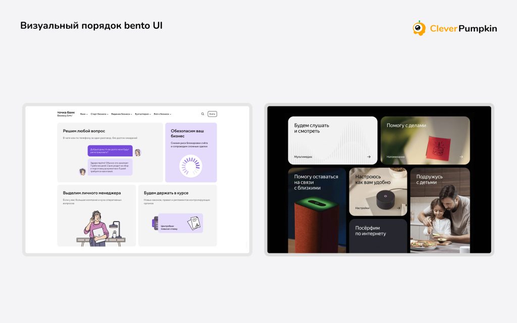 В отличие от карточного стиля, где элементы одинаковы по масштабу, bento использует блоки разного размера. Это позволяет точнее расставлять акценты — большие блоки выделяют важное, а меньшие поддерживают структуру и не забирают внимание.