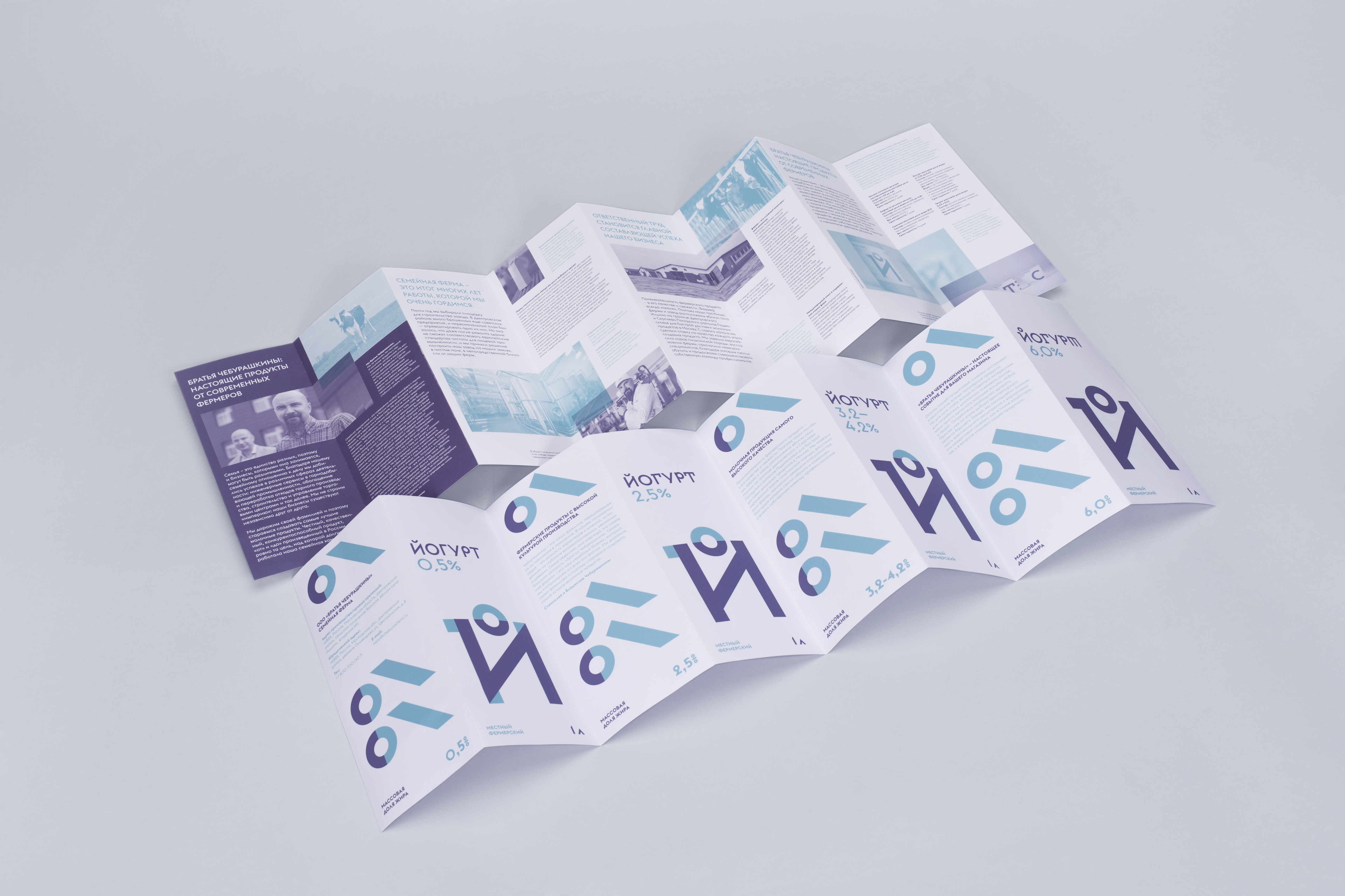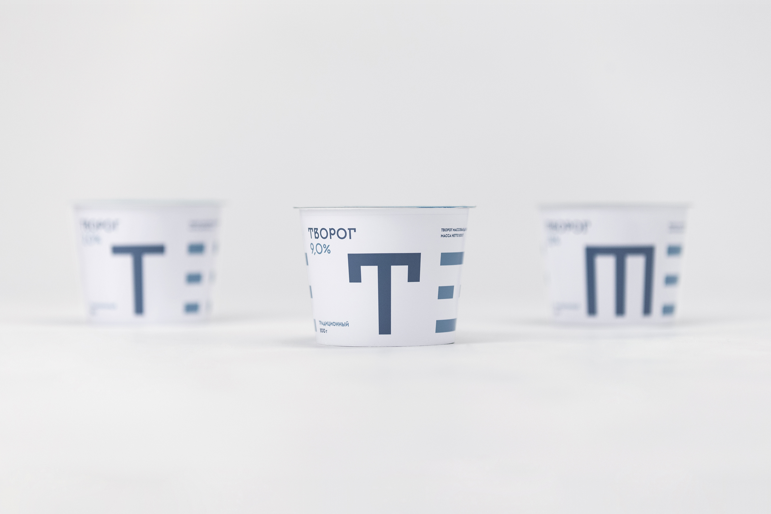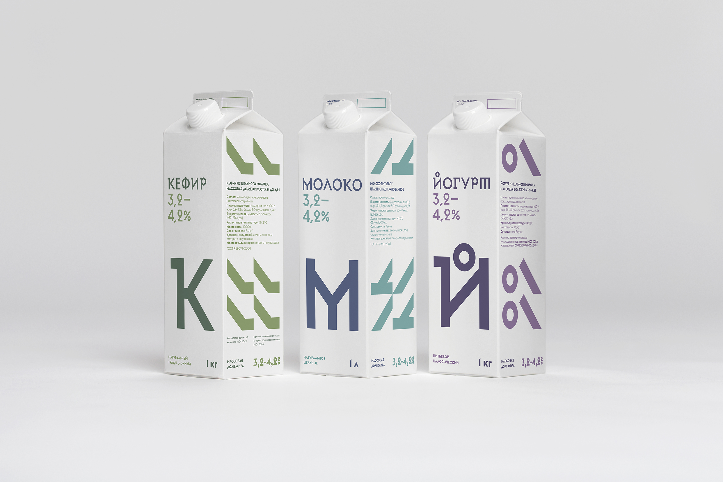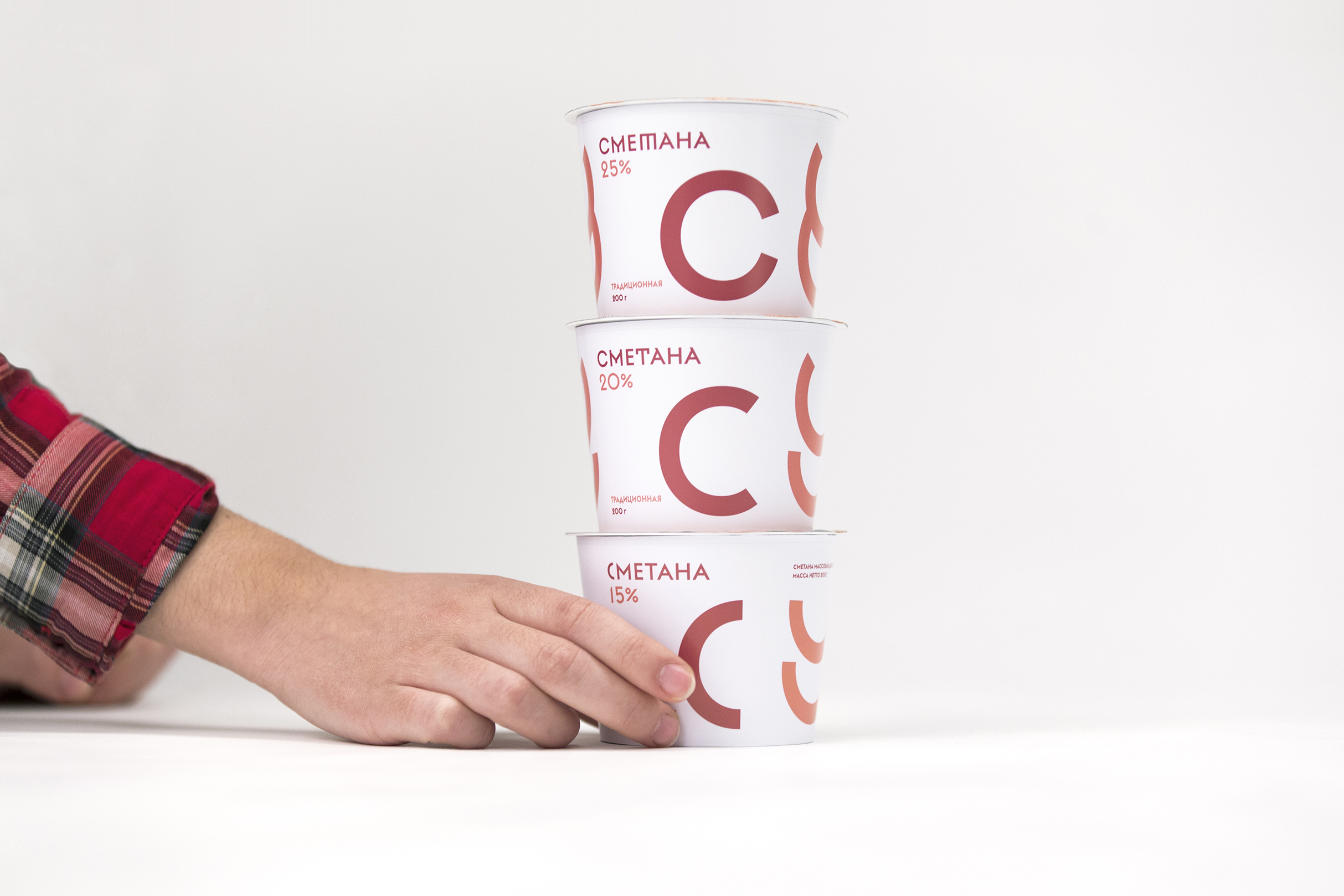 Идея упаковки построена на типографике: инициальные, первые буквы продукции являются главной частью дизайна. Мы разработали свой акцидентный шрифт с альтернативными формами знаков. Вдохновившись древнеславянскими символами, мы сконструировали собственную абстрактную графику на базе букв. Она является дополнительным элементом идентичности, отражая сельскохозяйственную тематику: поле, росток, стог сена, трава, ягоды и так далее. Как произрастает растение от семени к цветку, также инициальные буквы продуктов с графикой эволюционируют в соответствии с процентом жирности. Каждому продукту был присвоен основной цвет для типографики и дополнительный для графики.