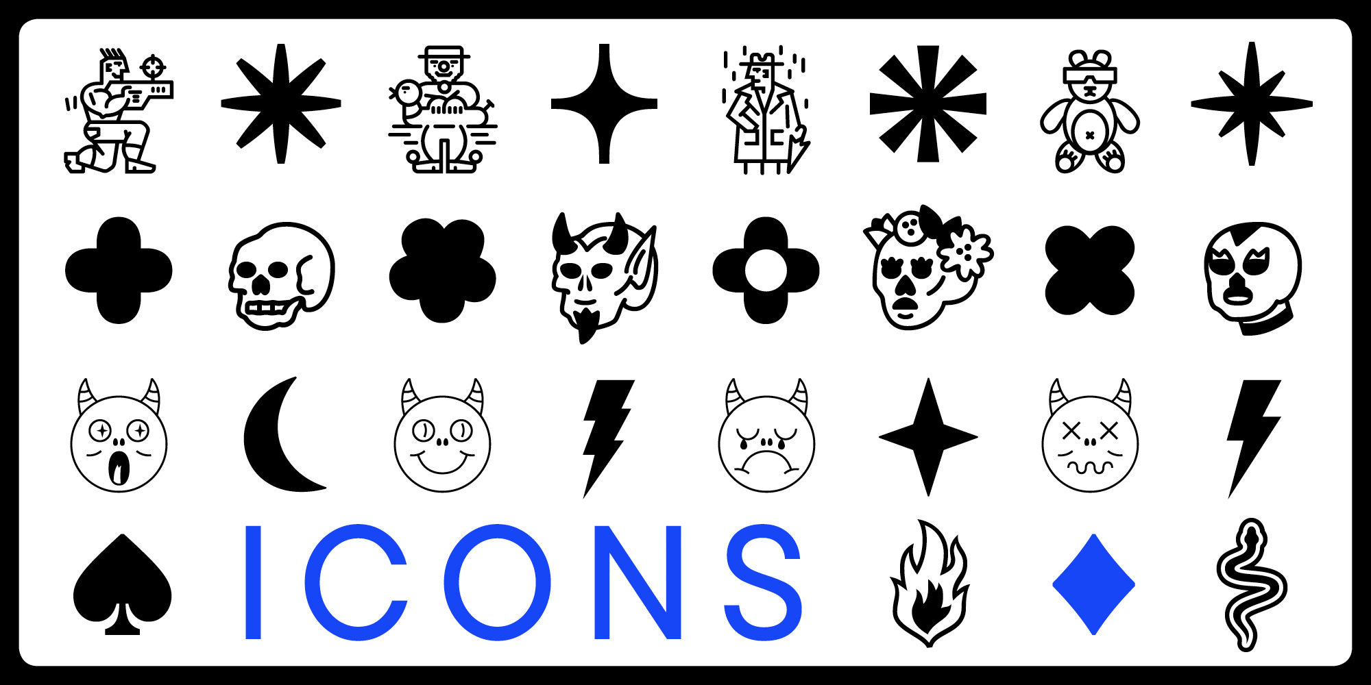 Иконки и иллюстрации — это более сложные графические элементы, которые рисуются для конкретного шрифта. Мы выбрали самые яркие примеры гарнитур TypeType, содержащих иконки, чтобы наглядно продемонстрировать, как их внешний вид зависит от общего стиля или назначения шрифта.