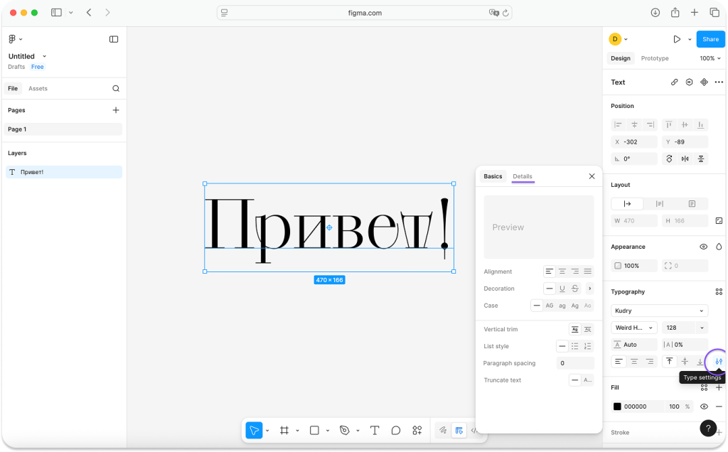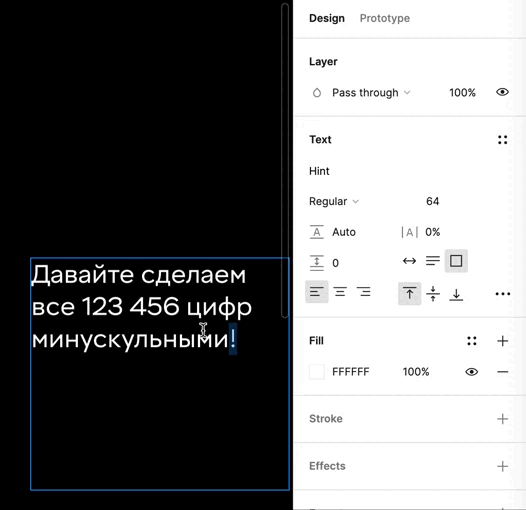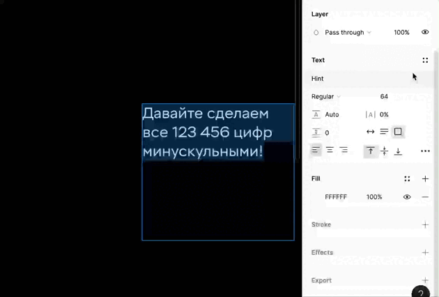 Всё, что нужно сделать в Figma, чтобы включить в тексте любой встроенный в шрифт вариант цифр или букв, — нажать на иконку настроек в правом нижнем углу панели Typography (раньше — панель Text) и выбрать вкладку Details.