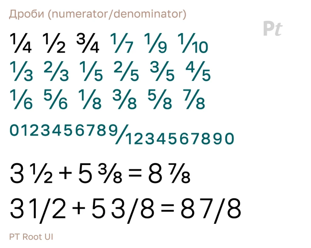Попрактиковаться в использовании типографических возможностей можно на бесплатных шрифтах. Например, в Golos есть минускульные и табличные цифры, в PT Root UI — табличные цифры и огромный набор индексов и дробей, в Tilda Sans — табличные цифры, индексы и альтернативные знаки.