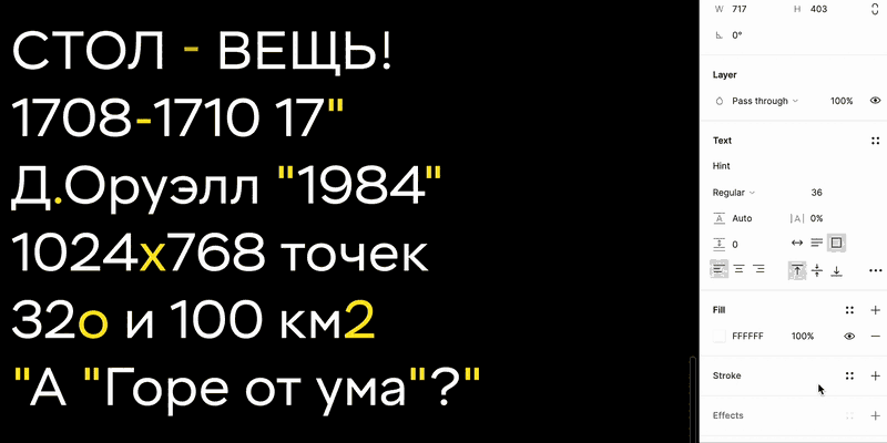 Тот шрифт, на котором мы показываем работу с типографикой — Hint — ещё и экспериментальный полигон по встраиванию микротипографа в шрифт. Точно так же через Details можно включить типограф, который будет на лету заменять тире и кавычки на правильные, и не только.