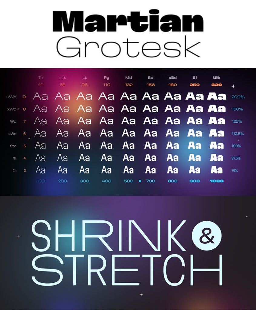 Martian Grotesk. Современный вариативный гротеск «Злых Марсиан» содержит 63 статичных начертания и изменяется по толщине и ширине. Оптимизирован для веба.