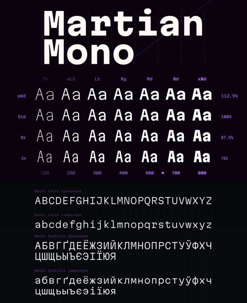 Martian Mono v1.1. Утилитарный шрифт для набора кода со специальными лигатурами, которые используют в языках программирования. Содержит четыре варианта ширины, в каждом из которых по семь вариантов насыщенности.