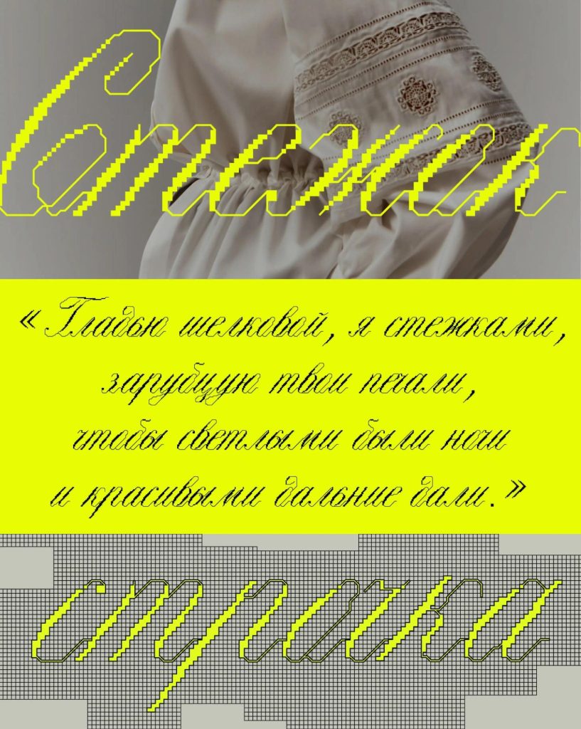 Стежок. Декоративный шрифт, вдохновлённый алфавитами из схем по вышиванию. В основе шрифта — прописи XIX века, которые были пикселизированы.