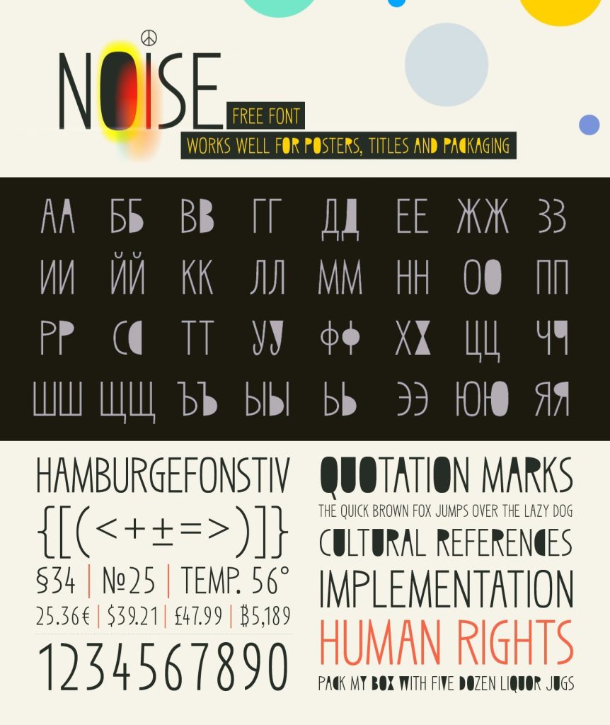 Noise. Лёгкий жизнерадостный гротеск в двух вариантах: базовом и со сплошными декоративными заливками. Подойдёт для упаковок, плакатов, брендинга и детских проектов.