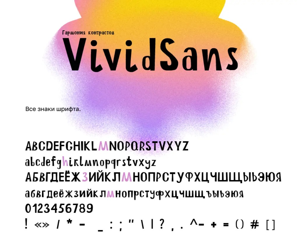 Vivid Sans. Игривый акцидентный шрифт с чуть «гуляющими» толщинами и необычными скруглениями. Подойдёт для детских проектов или брендинга в сфере питания.