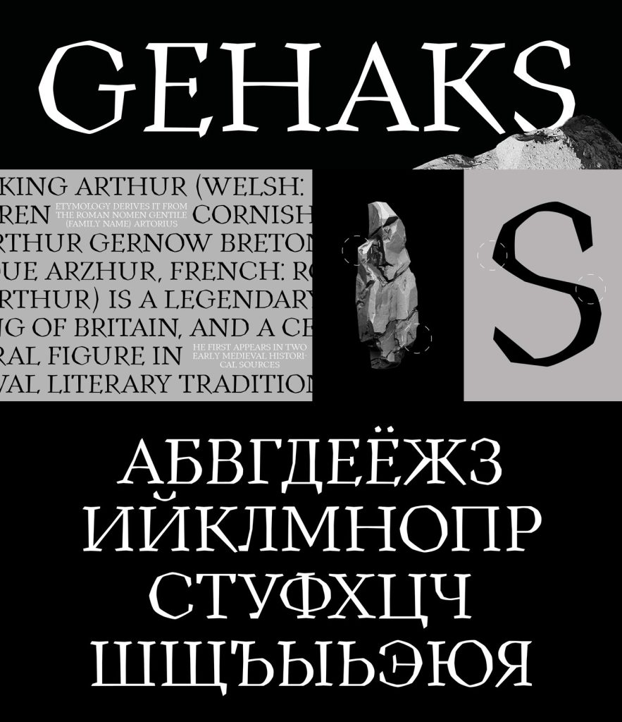 Gehaks. Акцидентная антиква с суровым характером, вдохновлена готическим стилем и скульптурами, вырубленными из камня. Имеет одно начертание и набор иконок.