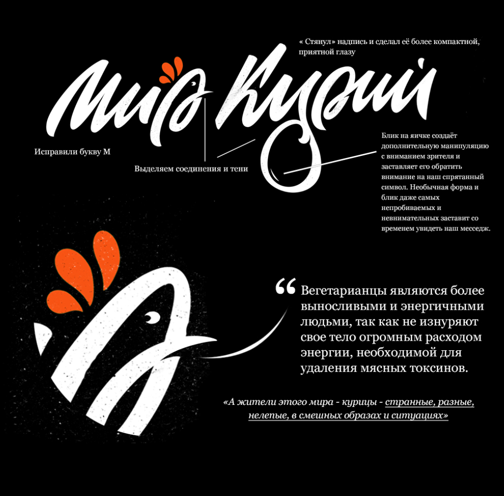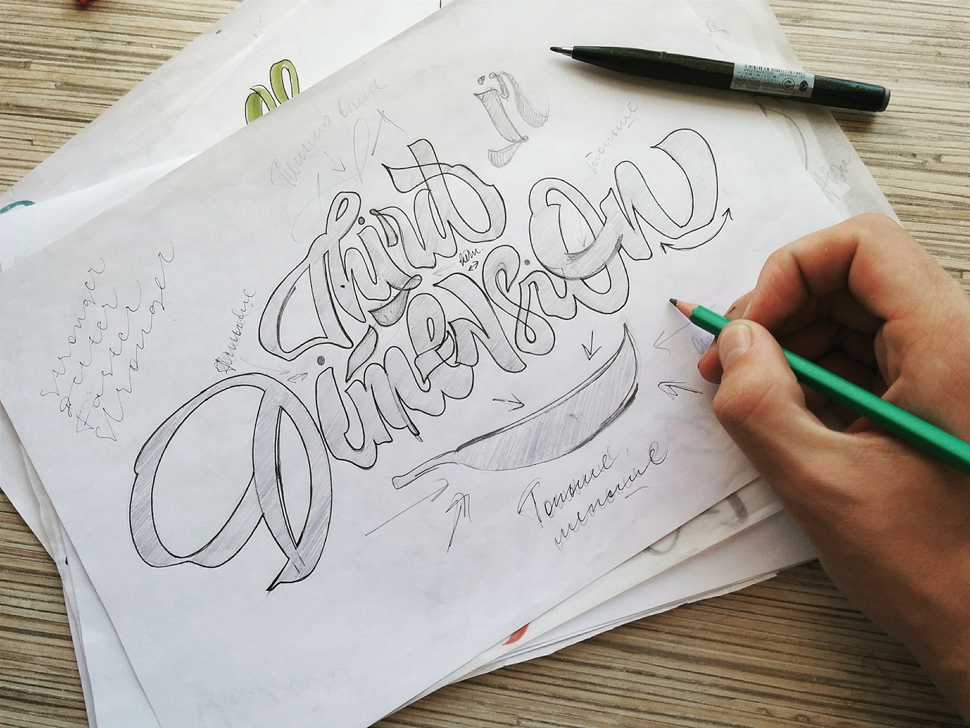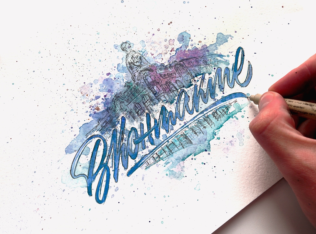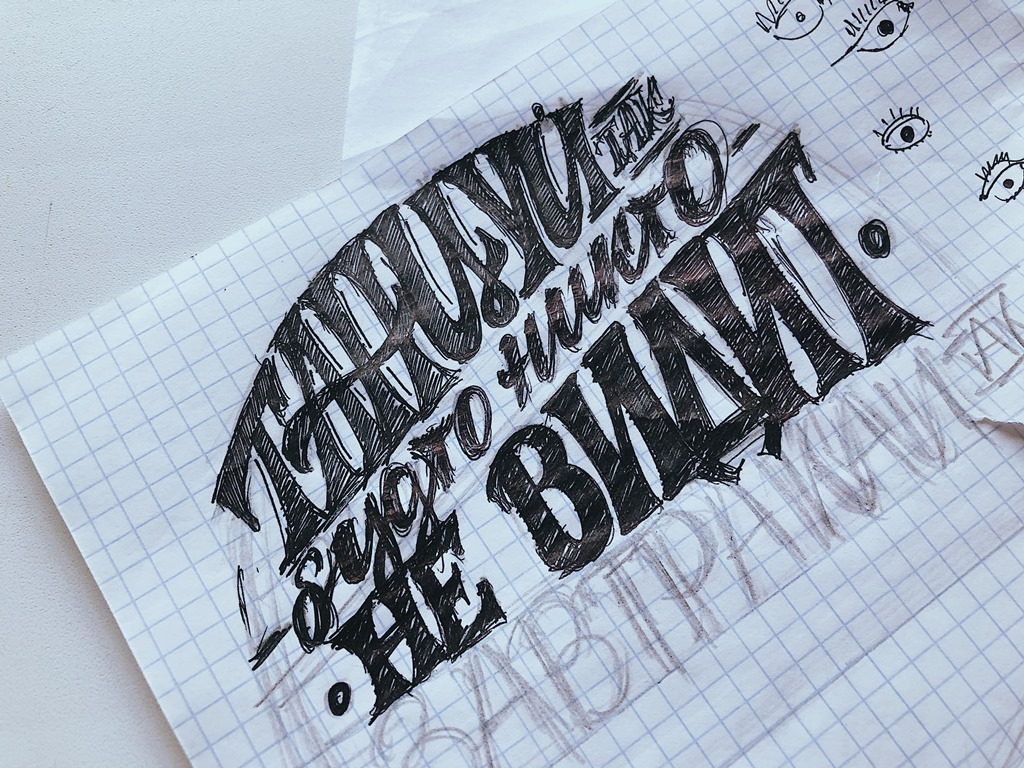 В-четвёртых, формат, для которого разрабатывается леттеринг. Иногда необходимо, чтобы он подходил для разных носителей: футболка, кружка, обложка на паспорт. Всё это нужно учитывать, и порою приходится прорабатывать каждый вариант.