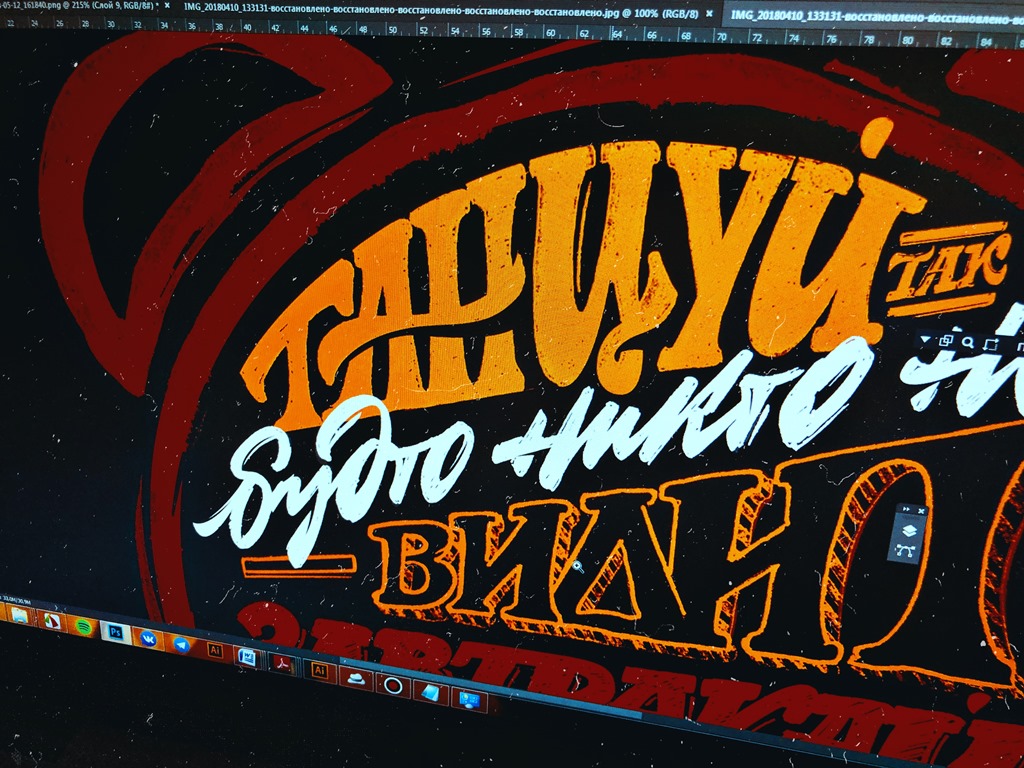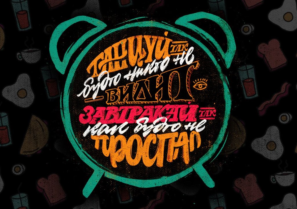 Окей, давай на примере шрифтовой иллюстрации. Фраза «Танцуй так, будто никто не видит, завтракай так, как будто не проспал». Я нарисовал её для публикации в своём паблике, когда он получил Прометей (нововведение ВК, оказывающее поддержку авторам и сообществам с уникальным контентом — прим.ред.). В таких работах важно найти интересную композицию и расставить акценты, каждое слово должно быть своего размера, стоять на своём месте, привлекать свой процент внимания.