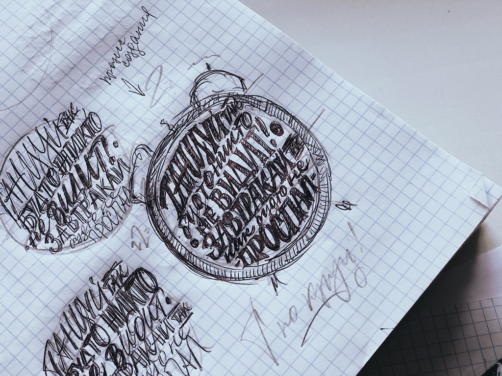 Здесь я начинал с маленьких набросков на бумаге. В мелких форматах проще найти композицию, уходит меньше времени. В качестве иллюстрации решил использовать будильник, соответственно, композиция будет круговая. Когда нашёл начертания, расставил акценты и каждую строчку поставил на своё место, то приступил к большому формату и детализации. После этого создал чистовой набросок, пытался искать цветовые решения и сканировал. Фотошоп помогает исправить пробелы в композиции, доработать какие-то буквы, убрать грязь, добавить текстуры, легко работать с цветом через инструмент «Карта градиента».