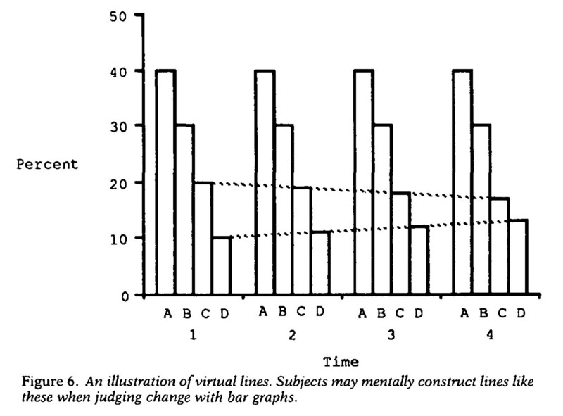 Закс и Тверски [12] обнаружили, что при описании гистограмм люди говорят о контрасте между значениями переменных в столбцах («А больше по Х, чем B »), а в линейных графиках описывают тенденции («Когда X увеличивается, Y тоже увеличивается»).