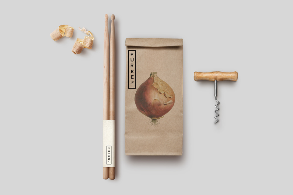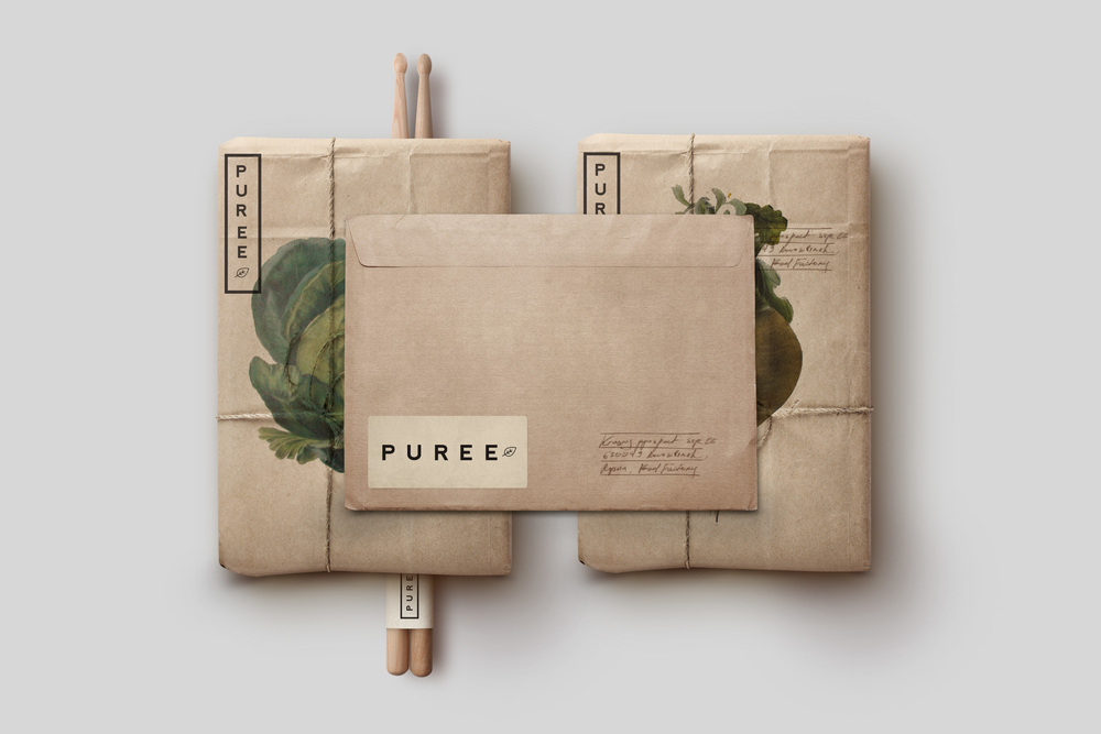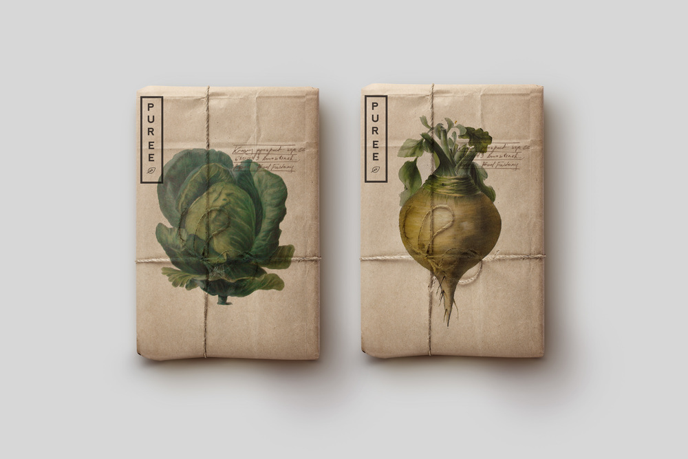 Сама студия говорит, что с самого начала для них было важно отразить в будущем дизайне отличие Пуре от обычных магазинов с натуральными продуктами. Действительно, фирменный стиль отражает органичность, чистоту и натуральность овощей, перенося нас немного в прошлое, когда все выращивалось на грядках вручную – без участия машин.