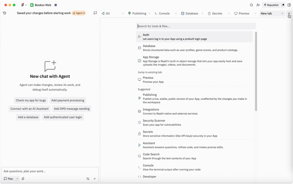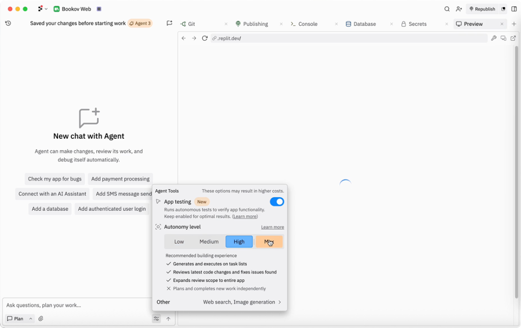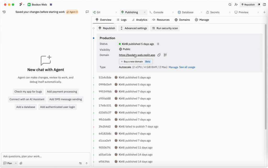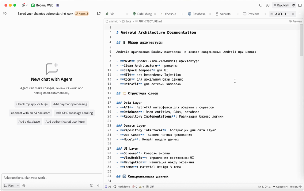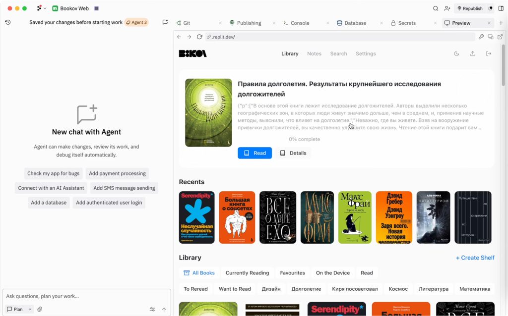 Если вы хотите разрабатывать продукт в одном окне, в том числе и с телефона, выбирайте Replit. Это полнофункциональная среда разработки с собственным агентом, который самостоятельно тестирует сгенерированные приложения. Есть режимы планирования и редактирования, логи, аналитика и база данных, а также можно развернуть продукт на хостинге.