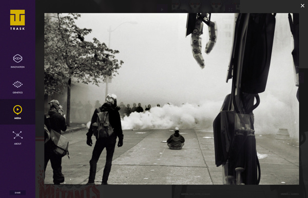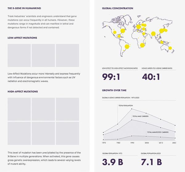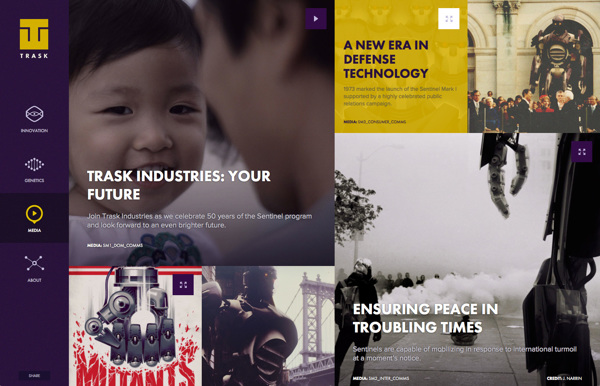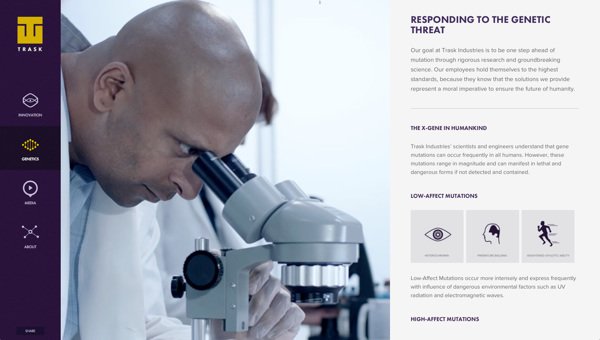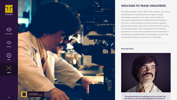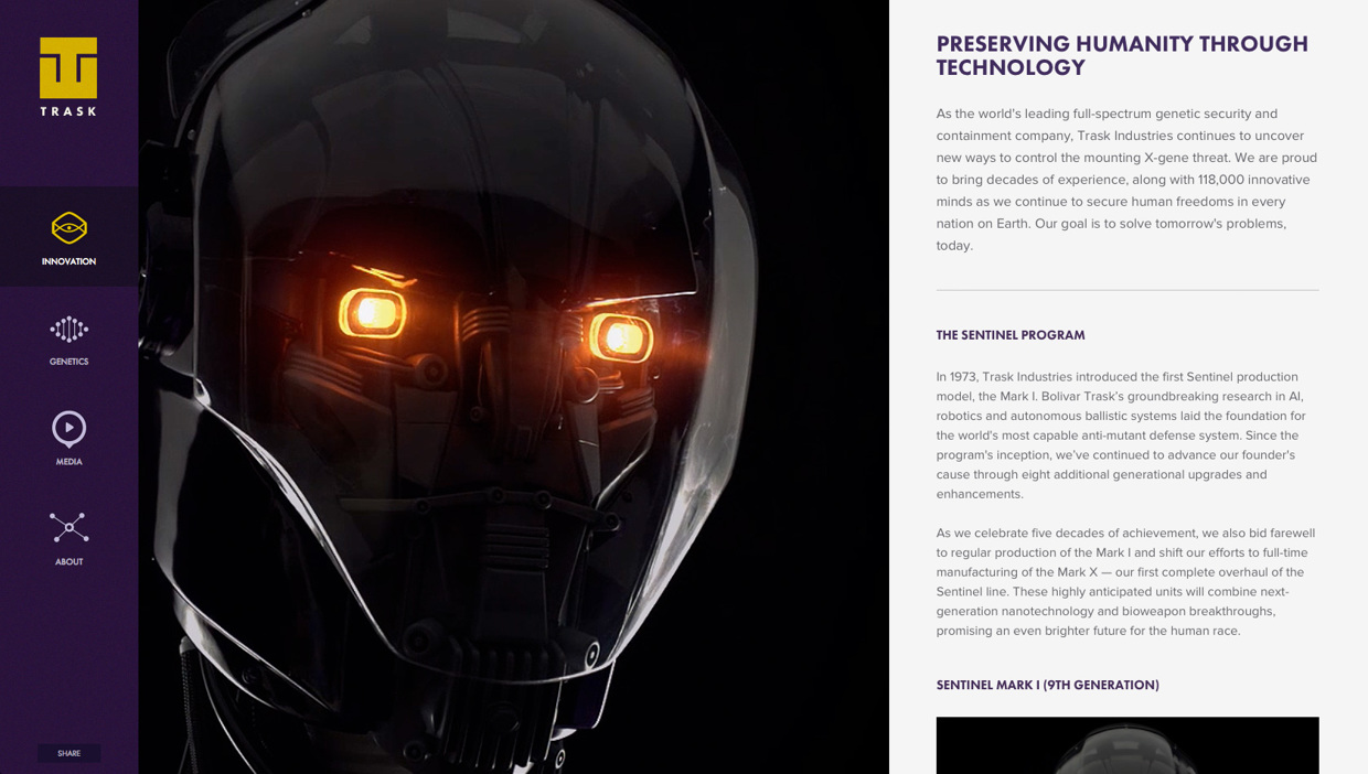 Сам веб-сайт посвящен злобной мега-корпорации, которая в сюжете фильма играет важную роль. У сайта Траск Индастриз четыре раздела: Инновации, Генетика, Медиа и О нас. Каждый из них заполнен и расписан, словно такая компания и правда существует.